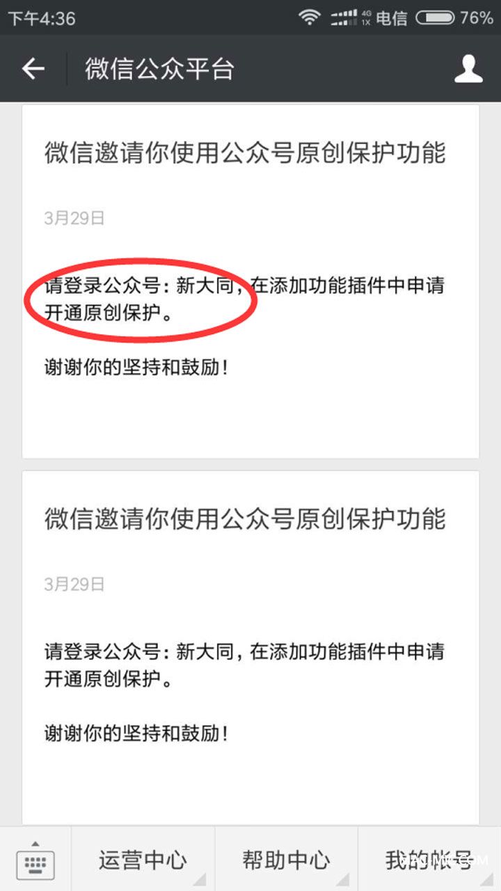 今天下午踏進辦公室,剛坐到位置上不久,就聽小編一聲驚呼:“我們獲得微信原創(chuàng)了”,高興的我差點從樓梯上掉下去,果然,“新大同”微信公眾平臺(sxdt_net)成為官方邀請,獲得申請開通“原創(chuàng)聲明”功能。