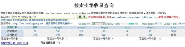 通過圖3大家可以發(fā)現(xiàn),通過這個網(wǎng)站查詢能夠一次性查出該網(wǎng)站各個搜索引擎的收錄和反向鏈接情況。還能查到googlePR值和sogouPR值。ALEXA排名和中國網(wǎng)站排名也一次性都查了出來。另外還有該網(wǎng)站的百度最近的收錄情況,百度快照日期,網(wǎng)站導出的鏈接數(shù)量等等。一次性把網(wǎng)站很多重要的質量指標都查了出來。這樣大家想了解自己網(wǎng)站和合作網(wǎng)站的基礎質量情況的時候,就可以通過這個工具一目了然。