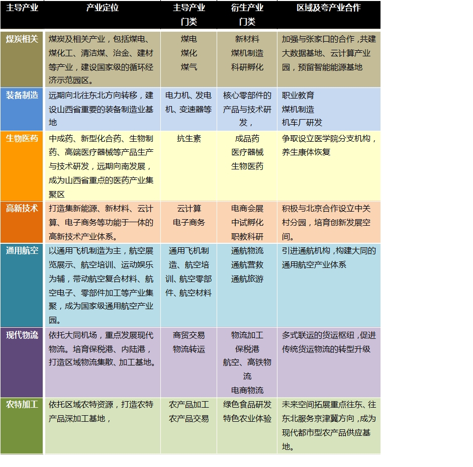 西部版塊為塔山循環(huán)示范區(qū),以煤炭工業(yè)為核心,縱向延伸煤炭相關(guān)產(chǎn)業(yè)鏈,促進(jìn)煤電一體化、精細(xì)煤化工發(fā)展;東部版塊包括經(jīng)濟(jì)技術(shù)開(kāi)發(fā)區(qū)、裝備園區(qū)、空港物流園區(qū),致力于傳統(tǒng)優(yōu)勢(shì)產(chǎn)業(yè)的提升;東南版塊為新興產(chǎn)業(yè)預(yù)留版塊,主要發(fā)展通用航空、新材料和醫(yī)療健康產(chǎn)業(yè);大同縣版塊主要發(fā)展農(nóng)特小微產(chǎn)業(yè);位于西北部的新榮板塊以農(nóng)牧產(chǎn)品加工、物流、石墨新材料為主。