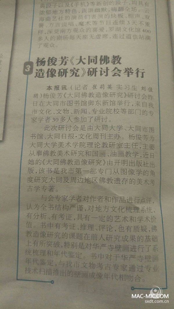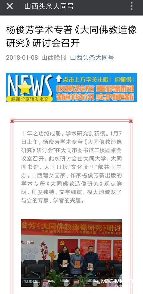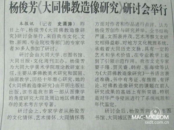 十年之功終成冊,學術研究創(chuàng)新績。2018年1月7日,伴隨著大同入冬以來的第一場瑞雪,楊俊芳的學術專著《大同佛教造像研究》作品研討會在大同市圖書館召開,本次活動由大同大學、大同市圖書館、大同日報·文化周刊共同主辦。來自大同大學、大同市文化界、學術界的眾多專家、學者、作家40余人共聚一堂,就該作品進行了研討。新大同網(wǎng)應邀參加了本次會議。