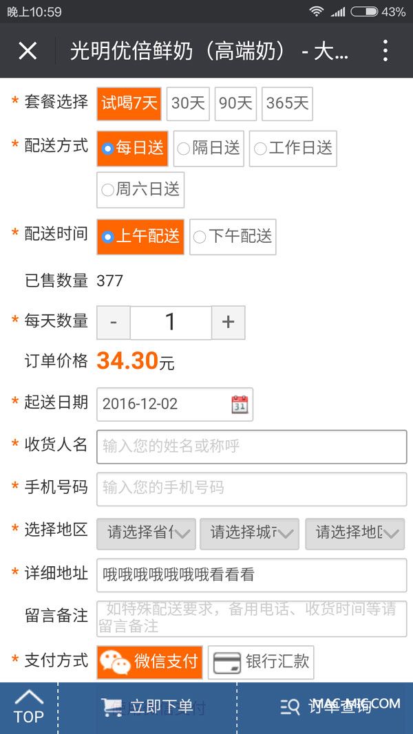 第二步:點(diǎn)擊“在線訂購”,確定訂購數(shù)量、價格、種類、起送時間、配送地址等信息,下單后微信付款。
