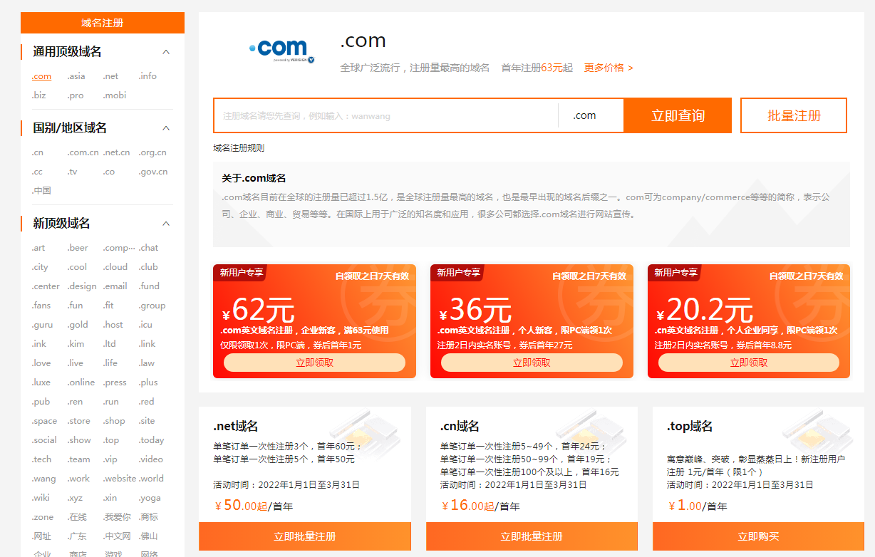 域名(需每年續(xù)費(fèi)) 國內(nèi)域名注冊商一共也沒多少家,全國比較知名的就阿里云(以前的萬網(wǎng))、新網(wǎng)這些的,其他小的注冊商幾乎都是這些大公司的代理,域名注冊費(fèi)用每年都在變,但是基本上價格浮動不是很大。